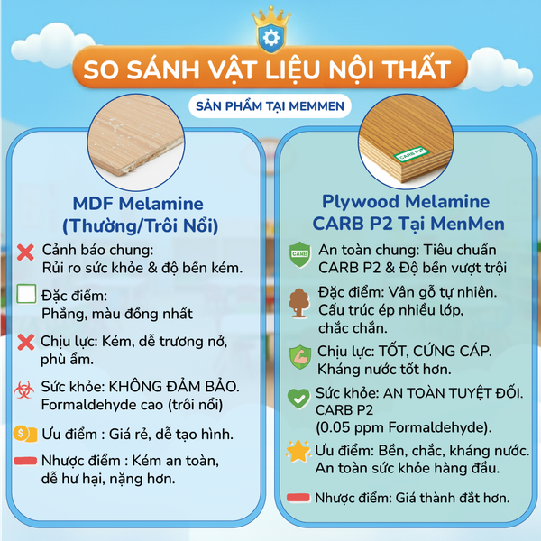 Trẻ em thường có thói quen tiếp xúc trực tiếp, thậm chí “nếm thử” các đồ vật xung quanh. Plywood phủ Melamine chất lượng cao đạt tiêu chuẩn E0 hoặc CARB P2, đảm bảo hàm lượng Formaldehyde gần như bằng không, góp phần bảo vệ hệ hô hấp non nớt của trẻ.